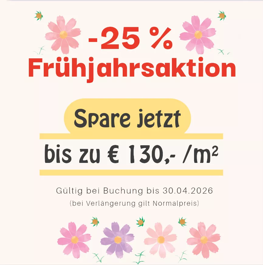 Die Miete beträgt bei Buchung bis 30.04.2026 je Quadratmeter € 7,50 pro Woche bzw. € 30,00 (statt € 40,00) pro Abrechnungszeitraum (4 Wochen) und hängt daher von der Größe des Abteils ab.